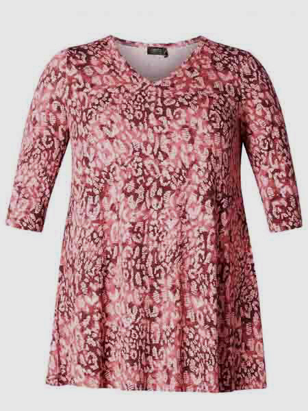 ist dieses Longshirt von Yesta aus Viscosejersey, bedruckt in rostrot und wollweiß. Es ist superbequem aufgrund der Weite am Saum, fällt relativ groß aus. Sie können auch eine Größe kleiner wählen, als Sie normalerweise tragen. Es hat einen V-Ausschnitt. Länge ca. 89 cm in Gr. 48.