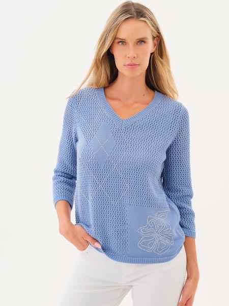 ist das Thema, zu dem dieser grob gestrickte Lochmusterpulli aus Baumwolle von Dolcezza gehört. Wir haben ihn in der Farbe hellblau, sand und in rosa vorrätig. Im Lochmuster sind am Vorderteil rechts Rechtecke glatt rechts eingestrickt, die betont sind mit Linien aus aufgebügelten silbernen Steinchen. Am Vorderteil links ist eine quadratische glatt rechts Fläche, auf der aus aufgebügelten Steinchen eine Blume geformt ist. Der Pulli hat einen V-Ausschnitt, ist gerade geschnitten. Alle Abschlüsse sind in Rippe gestrickt. Die Ärmel sind 7/8 lang. Länge in Gr. S ca. 64 cm.