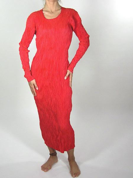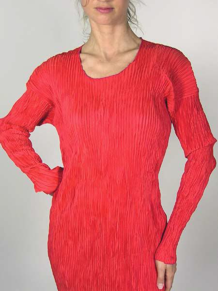 Plisséekleid von Leiko, figurnah geschnitten. Das Kleid ist wendbar und von beiden Seiten tragbar, die eine Seite himbeerrot, die andere Seite pink! Ein Kleid mit Überraschungen.