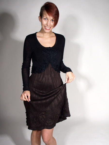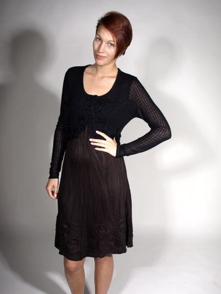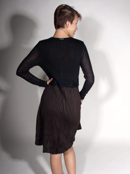 ist der schokobraune Stoff des Rockteil dieses schicken Kleides von 3322, eine neue Kollektion aus Frankreich. Das Kleid ist tailliert, am Saum ausgestellt. Das Oberteil ist aus elastischem Jersey, das Vorderteil ist geschmückt mit Wollborten. Die Ärmel sind aus transparentem Strickstoff. Länge des Kleides ca. 100 cm.
