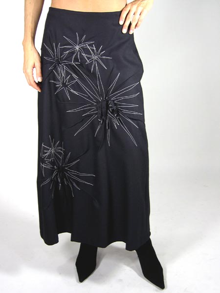 gearbeitet sind die Blätter aus Stoffstreifen, die auf die Stickereien auf diesem aussergewöhnlichen Rock von Ischiko aufgenäht sind. Der Rock ist schmal an der Hüfte, am Saum leicht ausgestellt, hat ein Futter bis in Kniehöhe. Länge des Rockes ca. 90 cm.