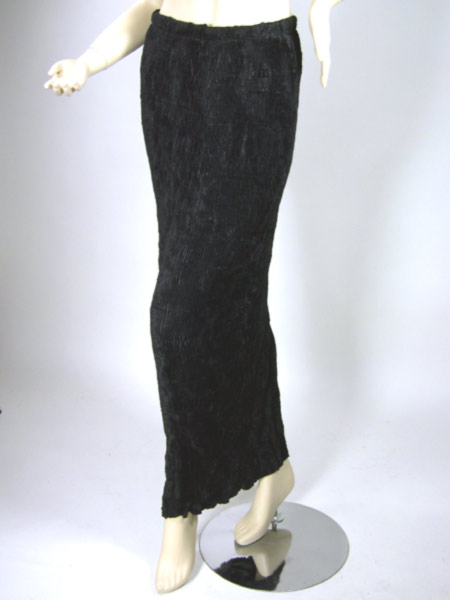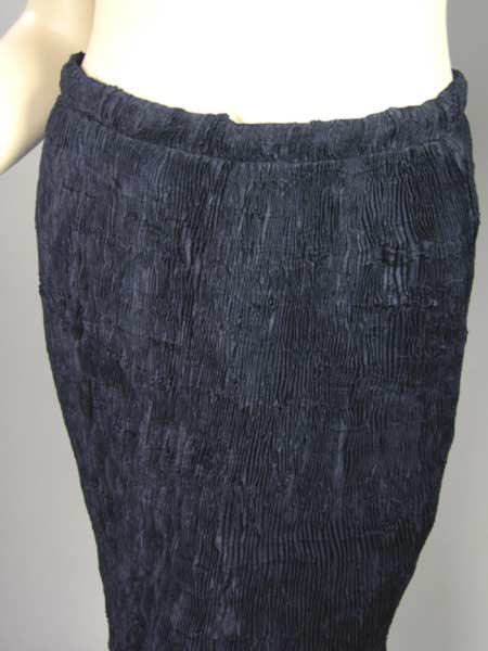 ist der Stoff dieses Rockes von Ischiko, gerade geschnitten, paßt sich Ihren Bewegungen an, engt jedoch nicht ein. An der Taille hat er einen flachen Gummidurchzug. Länge des Rockes ca. 101 cm.