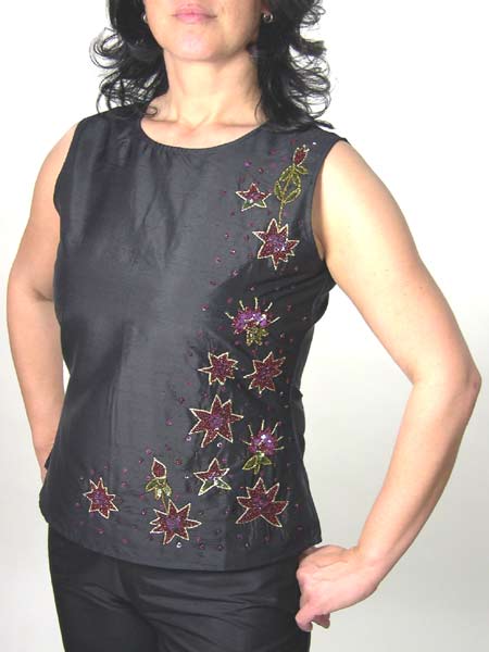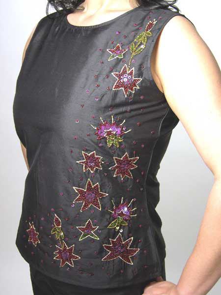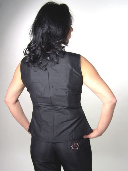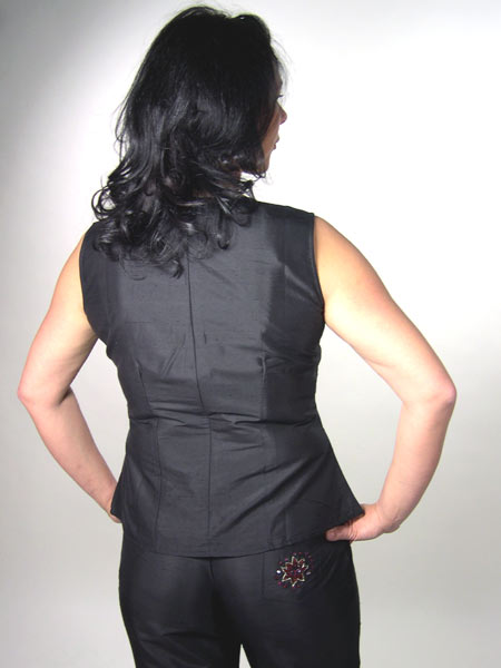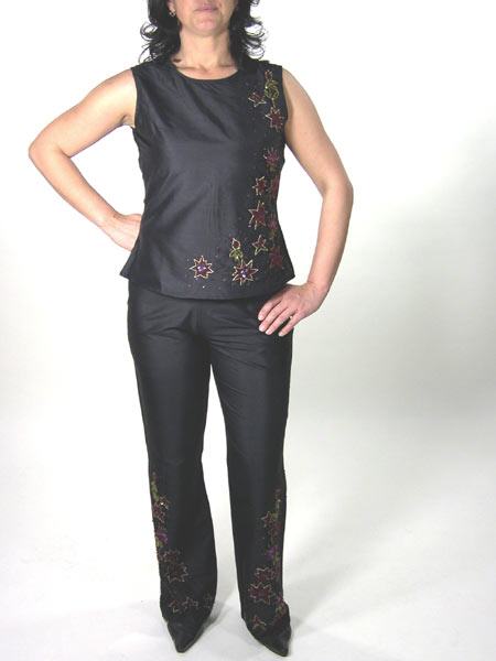 in den Farben weinrot, gold, grün ist dieses schwarze Seidentop von Kapalua. Es ist tailliert, wird am Rücken mit einem RV geschlossen. Passend dazu haben wir eine bestickte Seidenhose im Angebot.