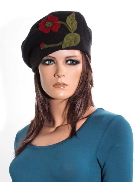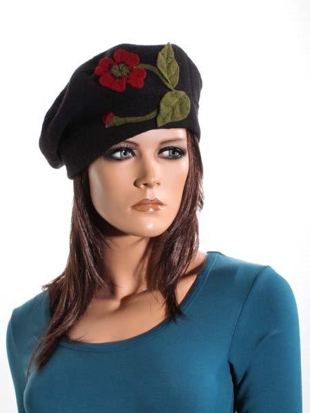 ist diese schwarze Filzmütze von Bellanatur mit Filzapplikationen in dunkelrot und lodengrün, mit Blüte und Blättern. Die Blüte ist zusätzlich bestickt. Sie können die Mütze knautschen, wie Sie wollen.