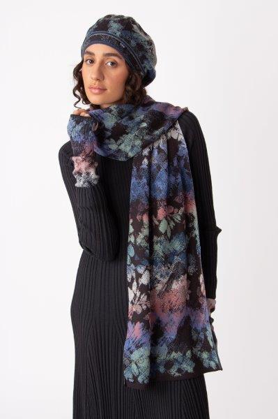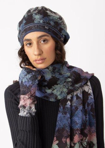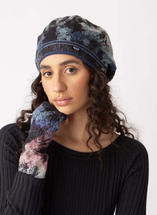 haben wir diese gestrickte Mütze Beanie in der Farbe anthra mit in den Farben jeansblau mint hellgrau und altrosa. Sie ist im Jacquardmuster wie mit stilisierten Blumen gestrickt zum Thema Camouflage