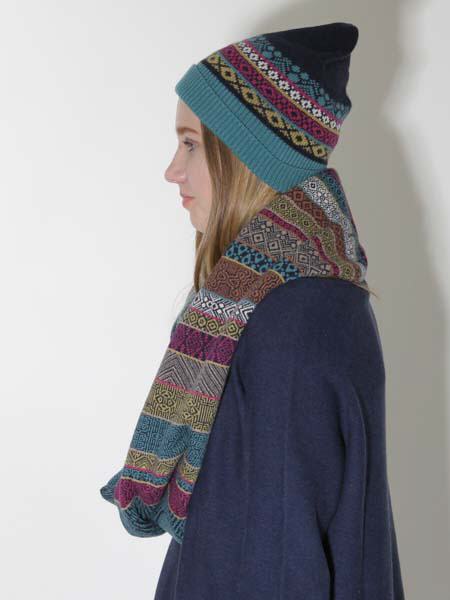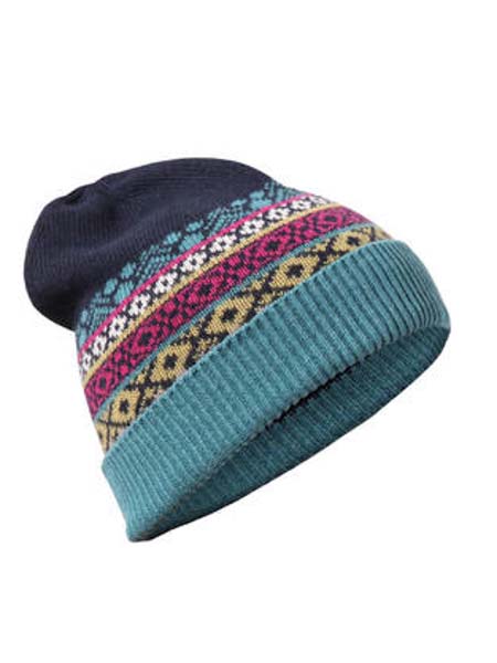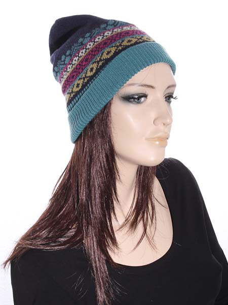 haben wir diese gestrickte Mütze von Ivko, kombiniert mit aubergine, gelb, sand, curry. Die Mütze ist in vielen Norwegermustern gestrickt, hat einen doppelten Rippenrand. Höhe ca. 23 cm.
