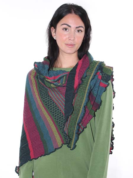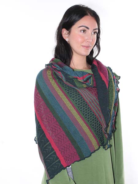 ist diese Strickstola, diesen Strickschal Kyra in Dreiecksform von Invero aus Wolle vom Merinoschaf, edles Material und zeitlos schönes Design, gestrickt in kleinen Lochmustern, Querrippen, Patentmuster und Streifen. Länge lange Seite ca. 240 cm, Höhe ca. 100 cm.