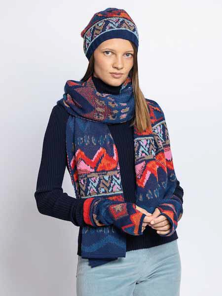 Wir haben diesen tollen Schal von Ivko, diese breite Strickstola in der Farbe 039 marine dunkelblau, gestrickt mit den Farben blau, rot, orange, taupe, pink, türkis