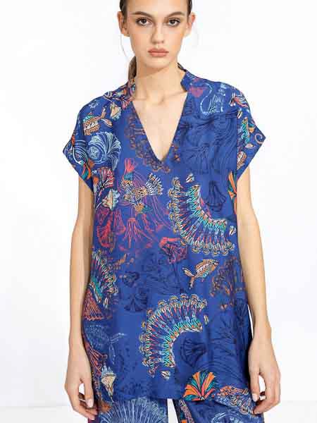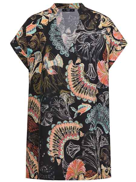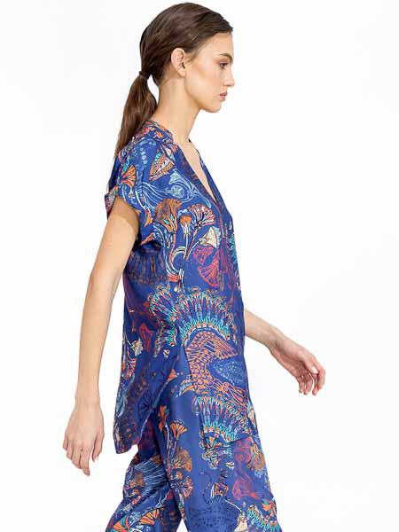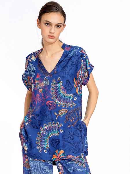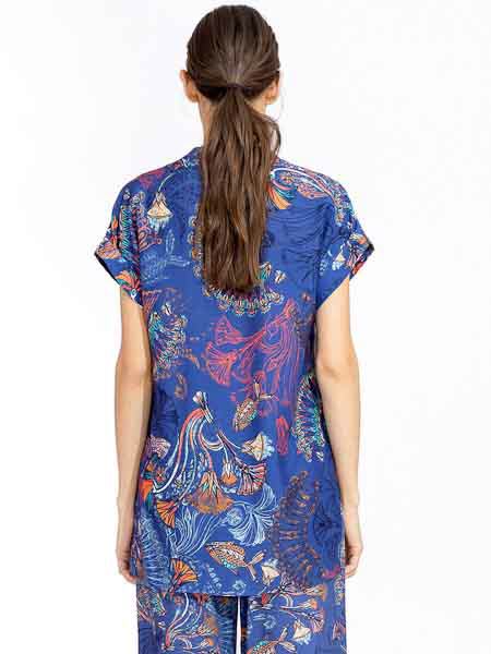 Sie hat einen V-Ausschnitt, einen flachen Kragen, überschnittene Schultern, doppelte Armausschnittblenden. Sie ist leicht A-förmig geschnitten, hat Schlitze an den Seitennähten. Der Stoff ist sehr angenehm auf der Haut, ideal für heiße Tage. Länge der Bluseca. 79 cm.