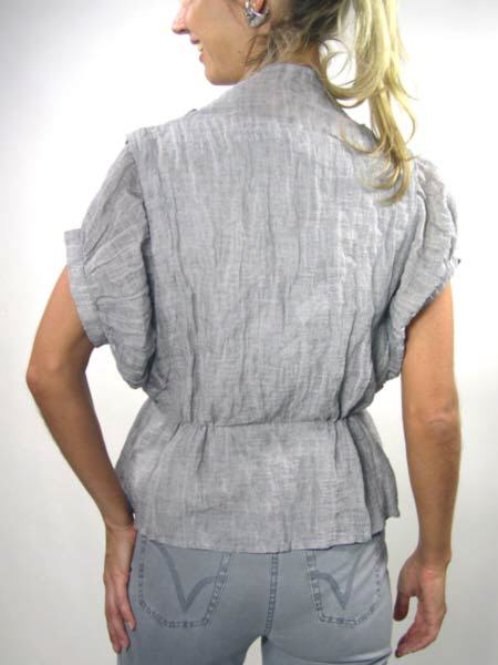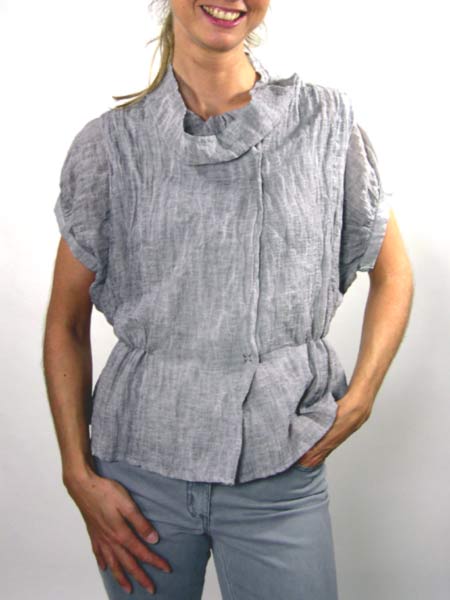ist der Stoff dieser leichten Sommerbluse von Crea, in Taillenhöhe seitlich gesmok, mit weichfallendem Stehkragen. Der graue Stoff wirkt gebatikt in verschiedenen Grauschattierungen. Länge der Bluse ca. 58 cm.