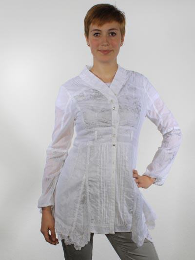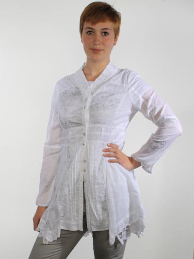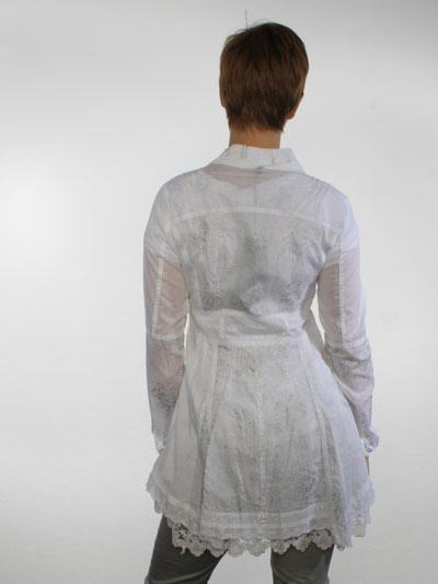 ist diese Blusenjacke von Fille des Sables, aus vielen verschiedenen weißen Baumwollstoffen gezaubert, in uni, teilweise mit silbernen Sprenkeln oder grauen Kritzeleien bedruckt. Die applizierten Baumwollbänder sind silbern durchzogen. Die tolle Blusenjacke ist tailliert, hat Schößcheneffekt und ist zum Saum hin mit verschiedenen Spitzenbordüren geschmückt. Länge der Blusenjacke ca. 87 cm. Die Bluse fällt sehr klein aus, wählen Sie im Zweifel eine Größe höher.