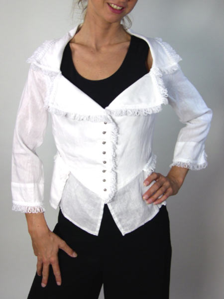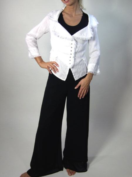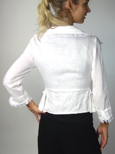 hat diese Blusenjacke von Isabel de Pedro an den Ausschnitt-, Taschen- und Manschettenkanten. Die Blusenjacke hat einen tiefen Ausschnitt, wird mit vielen Metallkugelknöpfchen geschlossen.