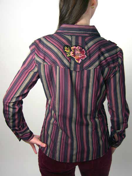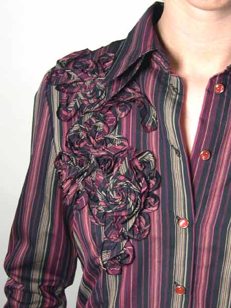 Schicke Bluse von Kapalua, in Streifen in den Farben weinrot/schwarz/kitt, mit Perlmuttknöpfen. Auf dem rechten Vorderteil sind Stoffstreifen appliziert, die kleine Rosen bilden. Die Bluse ist tailliert.