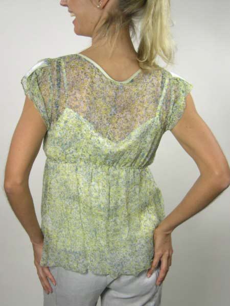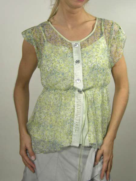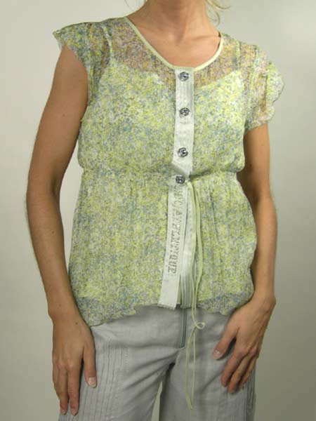 Romantische Bluse von Tricot Chic, aus transparentem Seidenchiffon mit Millefleurs-Druck in Pastelltönen. Die hochgezogene Taille mit Gummifäden bringt den Baby-Doll-Effekt. Die zarte Bluse hat eine Knopfleiste aus Glanzstoff und Druckknöpfen, der untere Part ist geschmückt mit Ministeinen, mit dem Schriftzug CHIC ATHLETHIQUE.