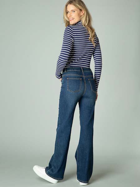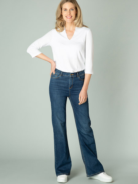 mit hohem Bund aus mittelblauem Denim von Yest. 5-Taschen-Modell und Verschluss mit Reißverschluss und Knopf, 2 Eingrifftaschen vorn und 2 aufgesetzte Taschen am Po. Durch die Zugabe von Elasthan hat diese Hosen eine bequeme Passform. Boot cut streckt optisch das Bein. Länge 32 inch.