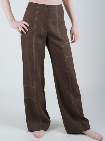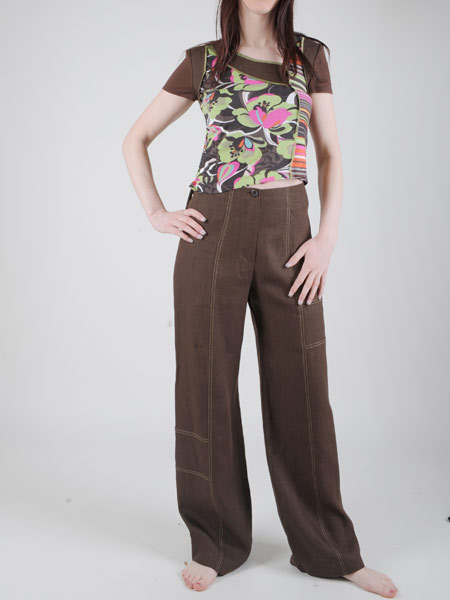 geschnittene Leinenhose im Marlenestil von Brigitte Cheneti, die Nähte sind in apfelgrün abgesteppt. Der RV ist vorne in der Mitte. Passend zur Hose haben wir ein Shirt im 70ger Jahre Look im Angebot.