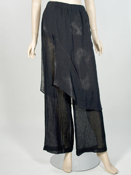 wirkt der Überwurf über der Leinenhose von Crea, am Bund sind beide Teile fest verbunden. Der Überwurf über der schwarzen Hose ist schwarz/schlamm gebatikt. Der Leinenstoff ist leicht gecrasht. Die Hose hat am Taillenbündchen Gummidurchzug mit variabler Weite. Länge ca. 104 cm.