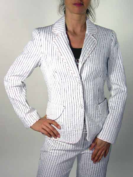 ist der Stoff dieser schicken Sommerhose von Kapalua mit zarten schwarzen Streifen. Der Stoffgürtel ist paspeliert, in diesem ist der feine Streifen rot. Die Hose ist gerade geschnitten, RV in der vorderen Mitte, 2 Eingrifftaschen und 2 Potaschen.