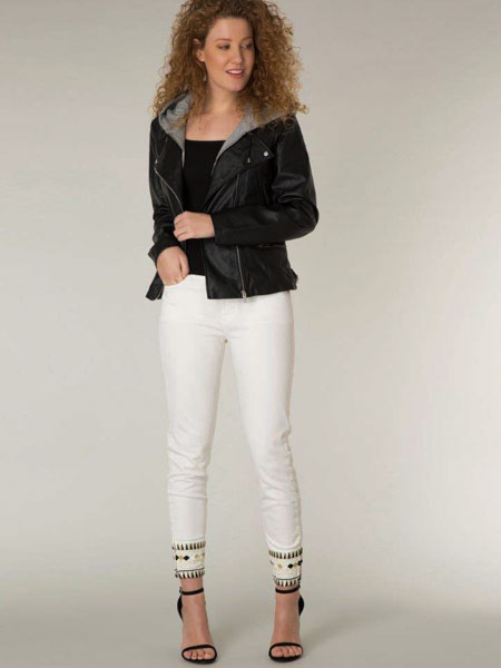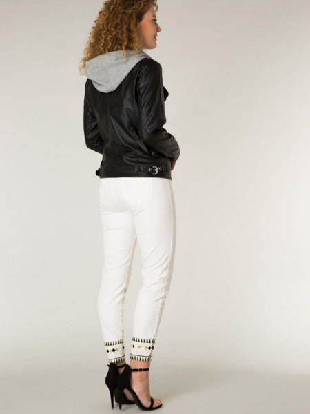ist die gestickte Bordüre in schwarz gold am Saum dieser wollweißen 5-pockets-Jeans von Yest. Sie hat an den Seitennähten am Saum kurze Metall-Reißverschlüsse. 1/2 Beinweite am Saum in Gr. 40 ca. 12 cm. Länge der Hose incl. Bund ca. 99 cm in Gr. 40.