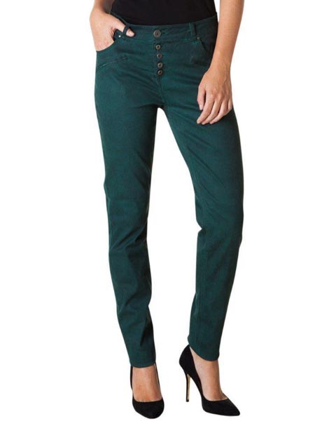 einem tannengrün, haben wir diese modische Jeans von Yest, mit sichtbaren Metallknöpfen. Sie hat an den Vorderbeinen 6 Taschen, 2 Potaschen. Die Beine sind schmal geschnitten, slim stretch. Der Baumwollstretchstoff ist leicht verwaschen, im aktuell used Look. Die Hose ist lang, für große Frauen geeignet. Auch gekrempelt sind die Jeans toll zu tragen.