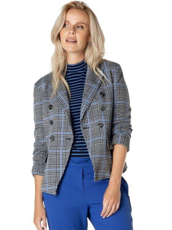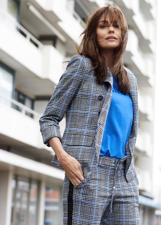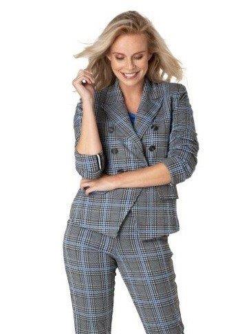 ist dieser Blazer von Yest, im topaktuellen Karomuster in den Farben blau, schwarz, hellgrau. Sie können ihn im Büro klassisch oder in der Freizeit zu Jeans tragen. Er hat Reverskragen, 2 Pattentaschen auf den Vorderteilen, wird doppelreihig geknöpft. Er ist tailliert, zum Saum hin etwas weiter. Länge ca. 59 cm am Rückenteil, ca. 67 cm an der längsten Stelle der Vorderteile in Gr. 40. Er ist schwarz gefüttert. Die Ärmel können Sie auch etwas krempeln, denn innen haben die Ärmel applizierte Ripsbänder in schwarz/hellgrau.