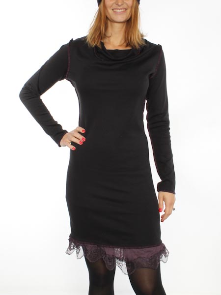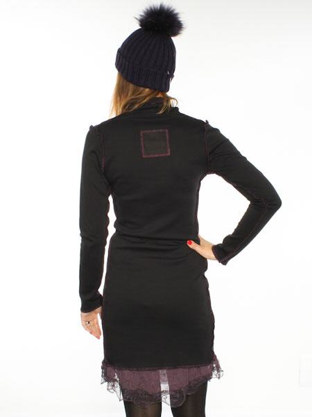 hat diese schwarze Tunika von Marie Cabanac, Sie können sie auch als Minikleid mit dicken Strümpfen tragen. Der hohe, angeschnittene Kragen fällt weich. Das Material ist biologische Baumwolle, angenehm zu tragen. Länge ca. 94 cm.