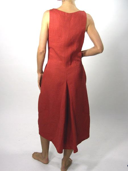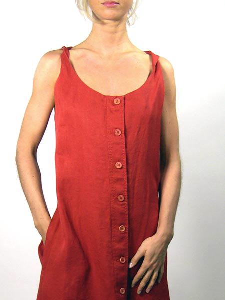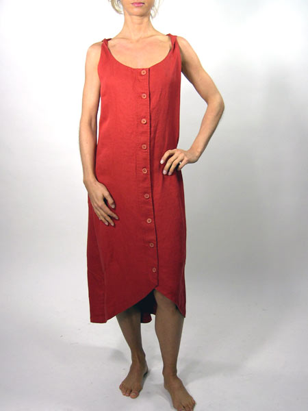 sind die Träger dieses schicken Leinenkleides von Crea in der Farbe terracotta, es ist leicht tailliert, zum Saum hin ausgestellt, hat an der hinteren Mitte eine Godetfalte. Das Kleid ist vorne etwa 105 cm, hinten etwa 127 cm lang, ist vorne durchgeknöpft und 2 bequeme Eingrifftaschen in den Seitennähten.