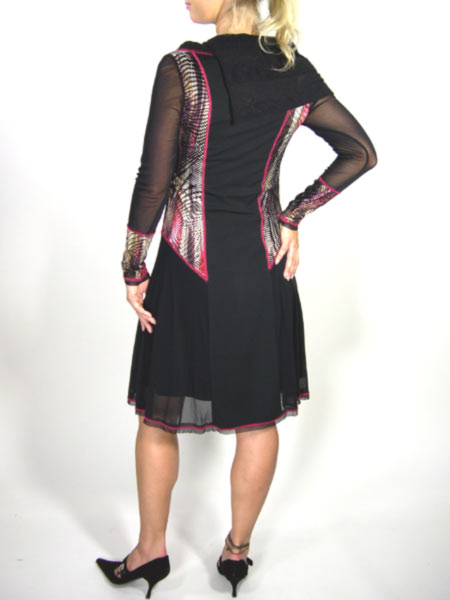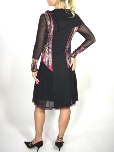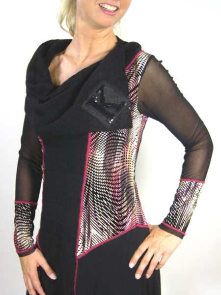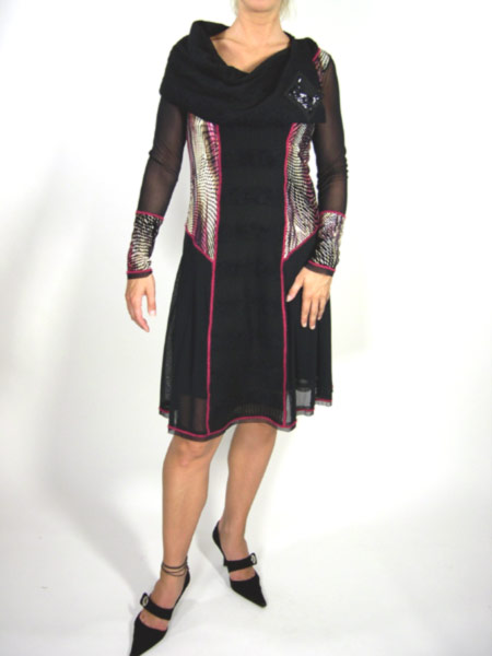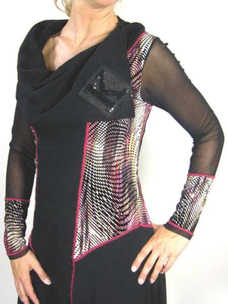 ist dieses Kleid von Kali Orea im Material- und Mustermix, der bedruckte Stoff wirkt samtartig, aus transparentem schwarzen Netzstoff und Lockmusterstrick. Viele Kanten sind mit rotem Kettelstich betont. Angenehm ist der weichfallende Kragen aus leicht angefilztem Strick, an der Ecke ist eine Applikation mit einem aufgestickten K aus Kailletten.. Das Kleid ist gefüttert, auch für empfindlche Haut ideal, wenn Sie keine Wolle vertragen. Länge des Kleides ca. 108 cm. Das Kleid fällt relativ gross aus.