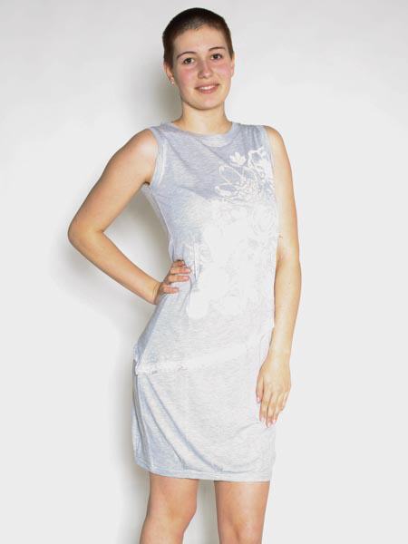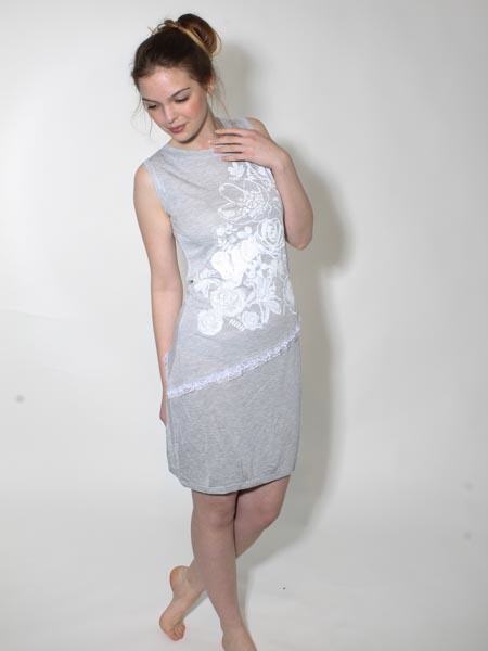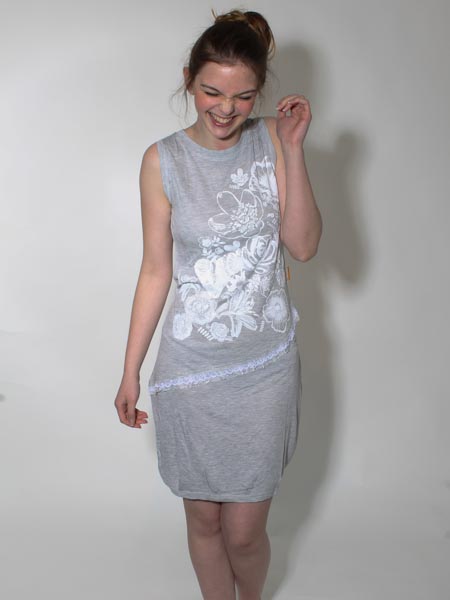 ist dieses Kleid von Mamatayoe, am Vorderteil bedruckt mit weißen Blumen und Blättern. Die diagonale Naht ist geschmückt mit einer weißen Spitzenbordüre. Das Kleid ist am Saum leicht ballonförmig geschnitten. Länge ca. 100 cm.