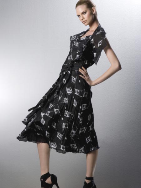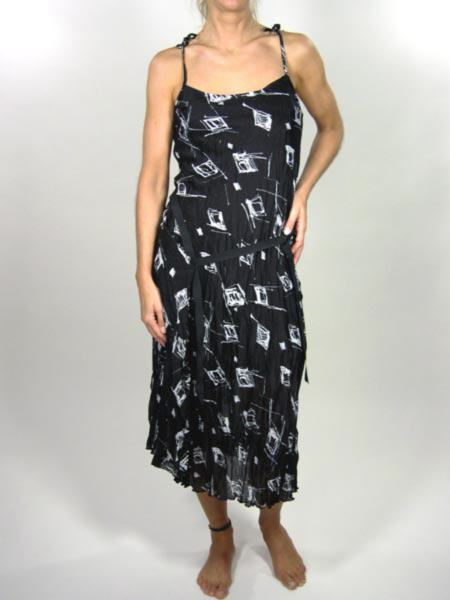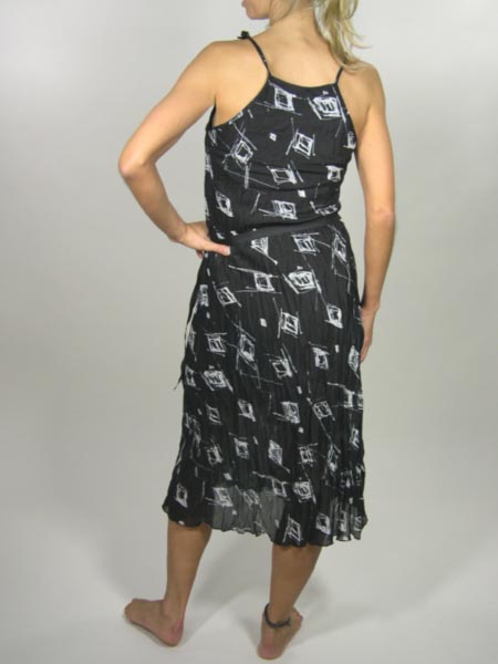Sommerliches Kleid von Xenia Design, aus einem knittrigen Stoff mit weissen Kritzeleien bedruckt. Das Kleid hat Spaghettiträge, ist gefüttert mit einem Baumwollstoff, sehr angenehm an heissen Tagen, und hat einen extra Kragen. Ds Kleid hat einen Wickeleffekt an der rechten Seite und 2 extra Bänder, spielen Sie,, knoten Sie vorne oder hinten. Länge des Kleides ca. 132 cm.