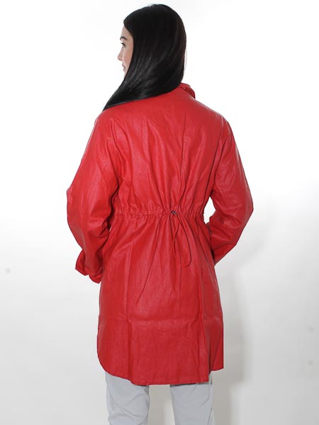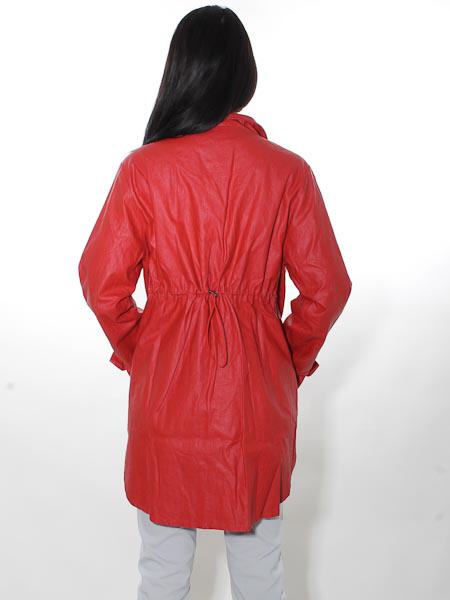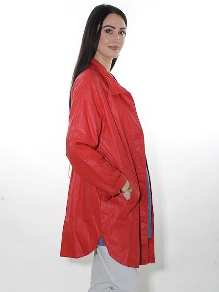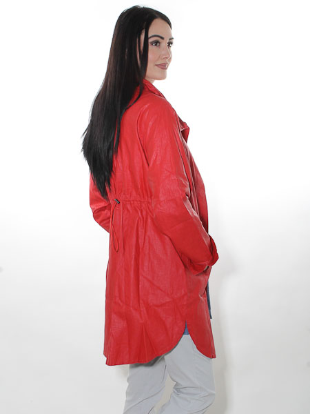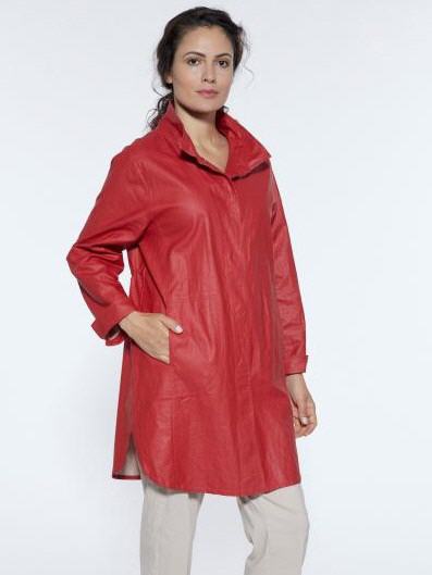 ist dieser lässige rote Mantel von Vetono gefertigt. Der Leinenstoff zeichnet sich durch seine typisch eher matte und einzigartige gewachste Oberfläche und seinen schönen Stand aus. Der Mantel wird verdeckt mit Druckknöpfen geschlossen. Er hat in den senkrechten Teilungsnähten 2 Taschen. Die Manschetten an den Ärmeln haben Schlitze, damit können Sie den Ärmel gut umschlagen, gut für kleine Frauen. Der Mantel ist gerade geschnitten, er hat an der Taille am Rückenteil Bänder, mit denen Sie die Weite variieren können. Die Saumkanten sind gerundet, mit kurzen Schlitzen an den Seitennähten. Länge ca. 94 cm in Gr. II.