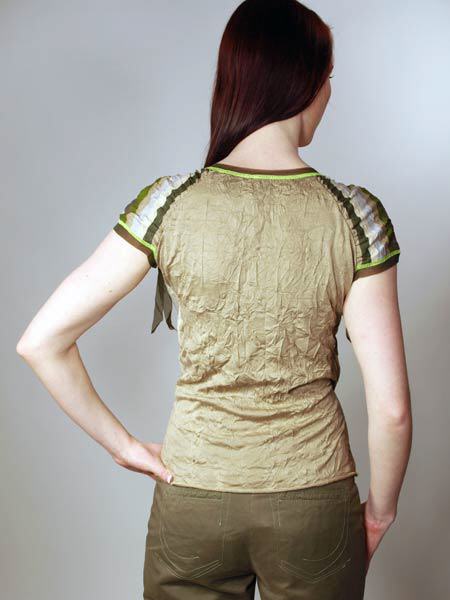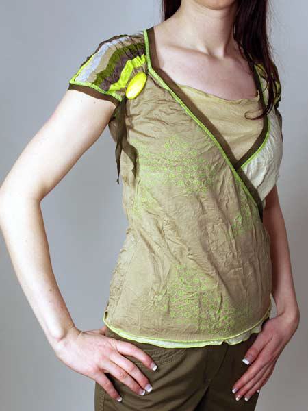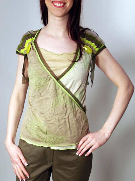 ist der Stoff dieses tollen Shirts von Kali Orea, in verschiedenen Khakitönen, uni und gestreift. Das Vorderteil sieht aus wie gewickelt, mit einer kleinen Raffung an der Seite, es hat noch einen kleinen Einsatz. Die Schultern sind überschnitten, der kurze Ärmel ist am Vorderteil mit Bändern und grossen apfelgrünen Steinen gerafft. Viele Kanten sind mit apfelgrünen Kettelnähten und einer dunkelgrünen transparenten Netzstoffkante betont. Länge des Shirts ca. 59 cm.