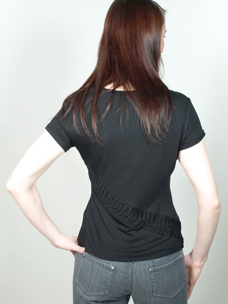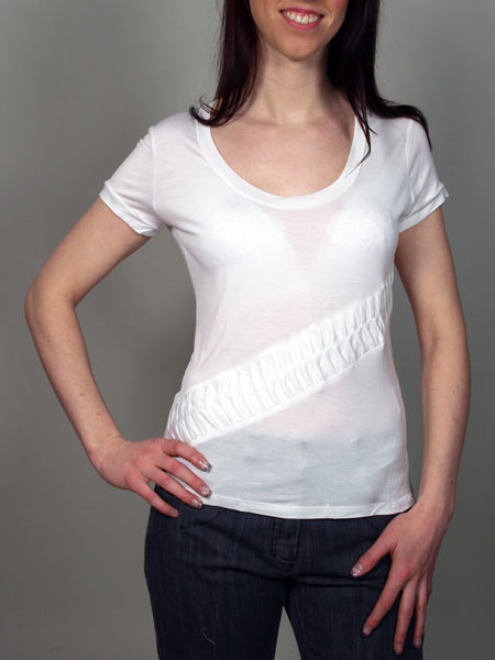 verlaufen die Raffungen an Vorder- und Rückenteil bei diesem Shirt von Vassalli. Wir haben es nur noch in weiss vorrätig. Das Shirt ist leicht transparent. Der Ausschnitt ist sommerlich tief. Länge ca. 62 cm.