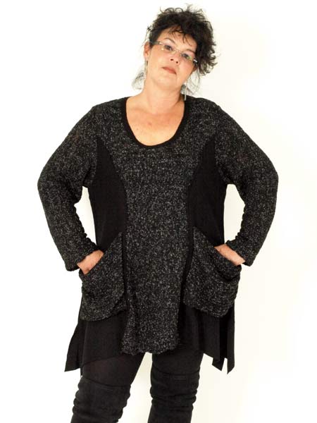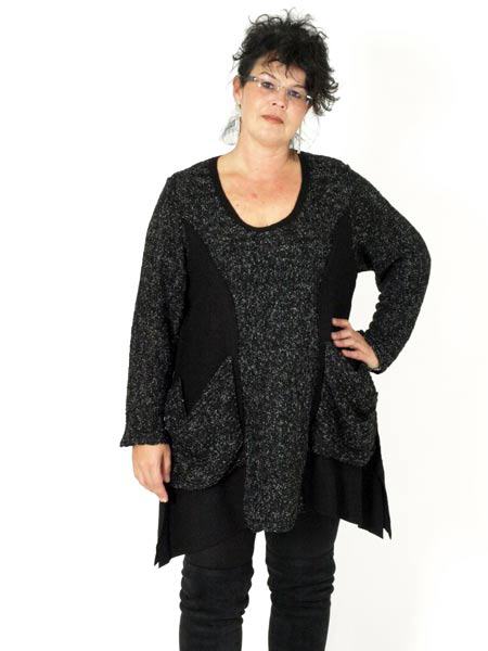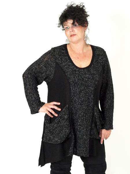 geschnitten ist dieser lässige Pulli von Goga Perr, aus Rippenstrick und filzartigem Stoff. Bequem sind die aufgesetzten Taschen, der Saum ist zipflig. Länge des Pullis ca. 88 - 98 cm.
