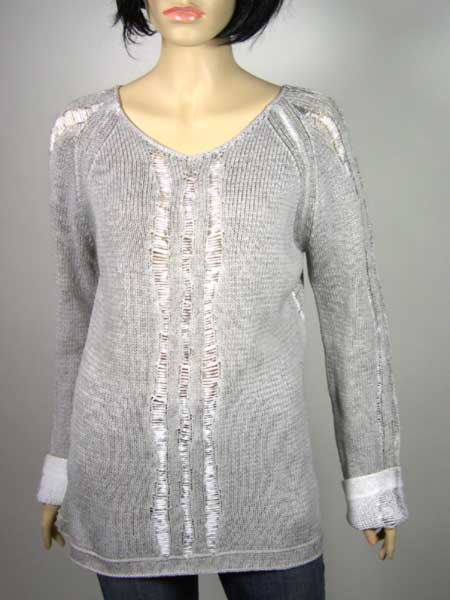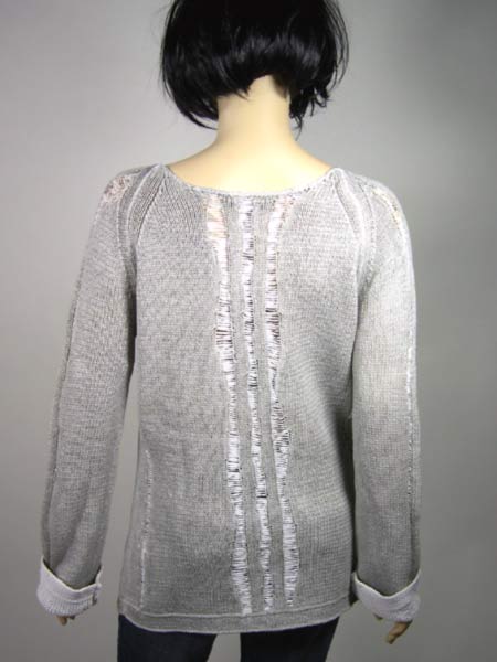 in hellgrau ist der ursprünglich weisse Bändchenpulli im Fallmaschenmuster von Kapalua. Deshalb ist die Innenseite weiss. Der Pulli ist leicht tailliert, Länge ca. 69 cm.