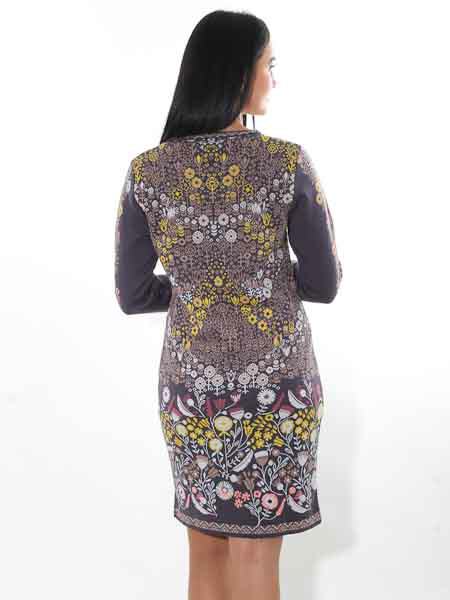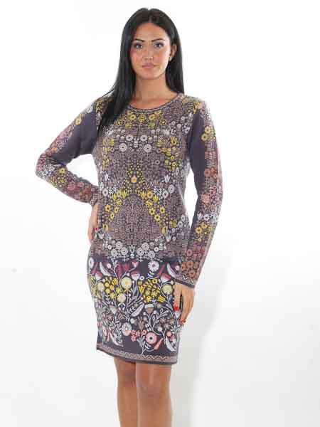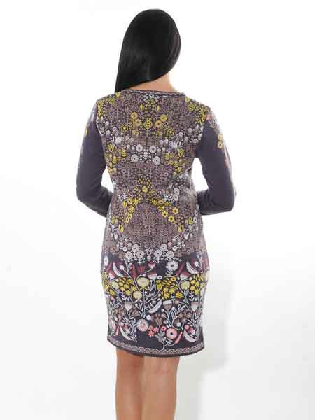 hat dieses Strickkleid von Glückspilz in den Farben grau, hellbraun, gelb, rost, mango, silbergrau, im Jacquardmuster mit floralen und geometrischen Motiven gestrickt. Es ist leicht tailliert, zum Saum hin gerade. Länge ca. 103 cm in Gr. L.