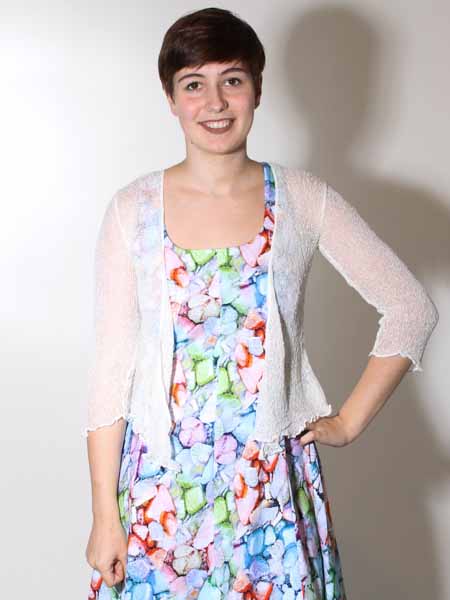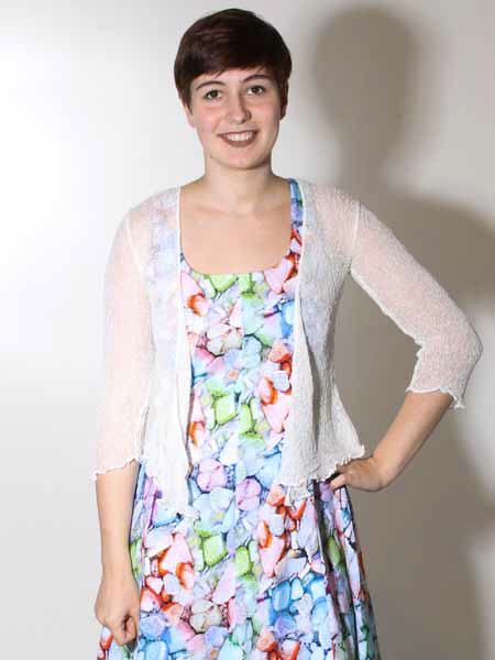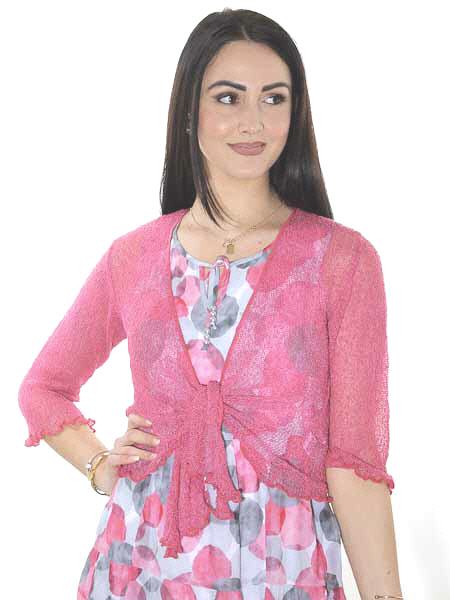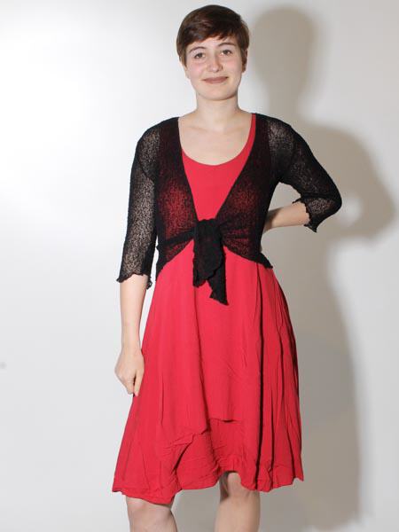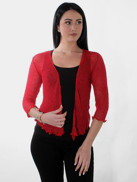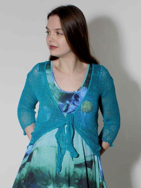 ist diese kurze Bolerostrickjacke, ideal zu tragen über ärmellose Kleider und Tops. Wir haben sie in vielen Farben vorrätig. Sie können sie offen oder geknotet tragen, das Gestrick ist superdehnbar. Das Jäckchen paßt von Größe 38-46.