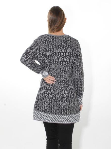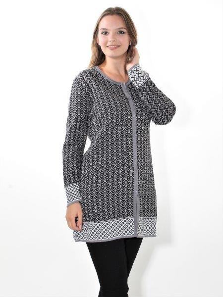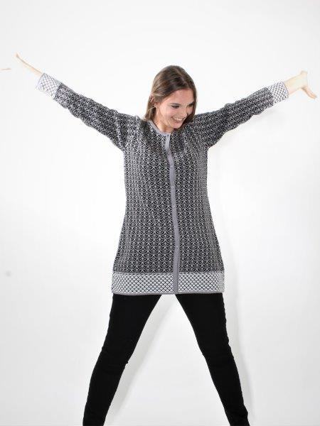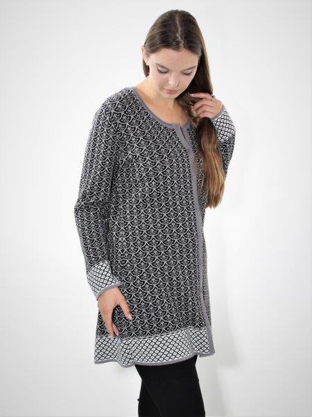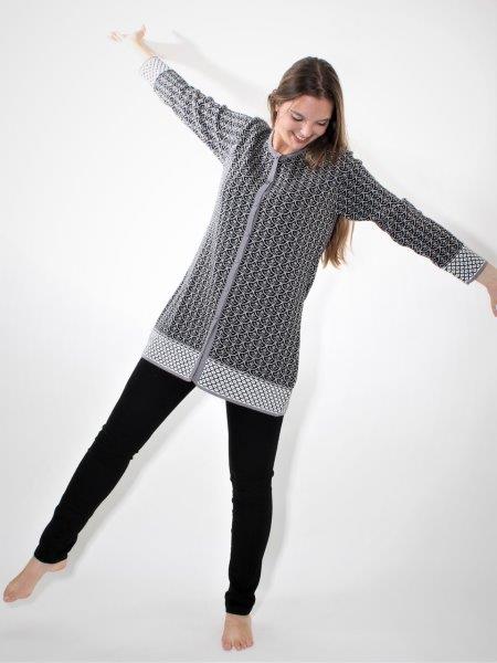 Sie ist in Jacquardmustern gestrickt mit den Farben schwarz, grau, wollweiß.