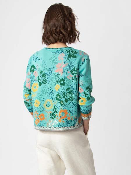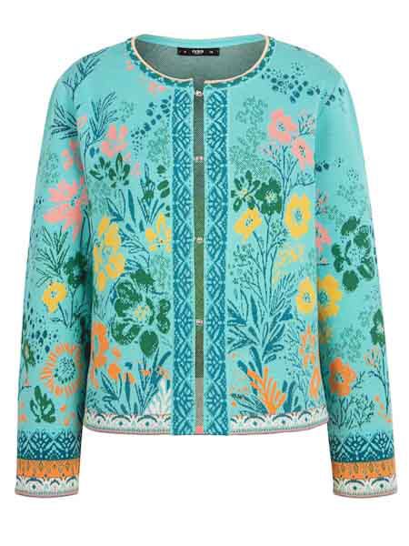 ist die Grundfarbe dieser schönen Strickjacke von Ivko, mit Blumen Mustern, floralen Mustern in den Farben türkis dunkelgrün petrol und ein wenig apricot, gelb und wollweiß. Sie hat einen runden Halsausschnitt, wird geschlossen mit 4 silbernen Magnetknöpfen in Kugelform. Die Ausschnittblende und alle Saumkanten sind im Bordürenmuster gestrickt. Die Ärmel sind am Handgelenk relativ weit. Länge ca. 57 cm in Größe 38.
