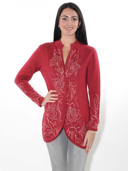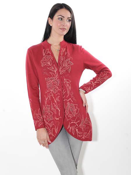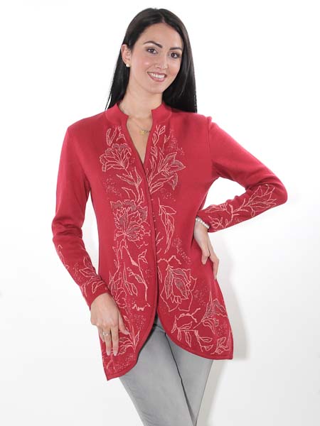 ist die Grundfarbe dieser schönen langen Strickjacke von Ivko, im Jacquardmuster im Stil von japanischen floralen Zeichnungen in den Farben apricot und aubergine. Sie wird verdeckt mit Druckknöpfen geschlossen. Sie ist tailliert, nach unten wie ein Gehrock geschnitten. Die Saumkanten an den Vorderteilen sind gerundet.