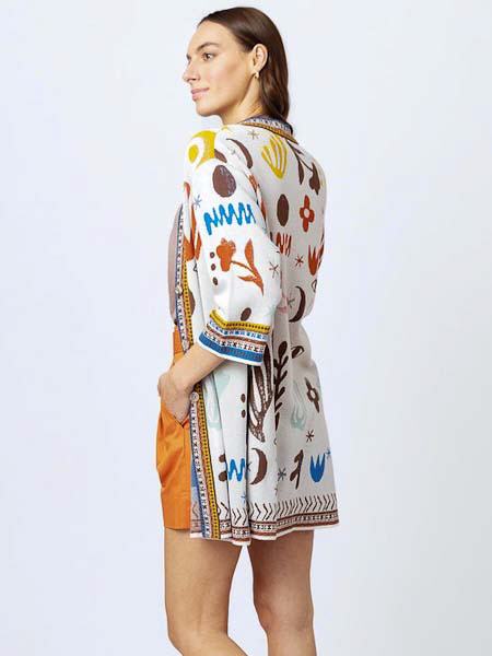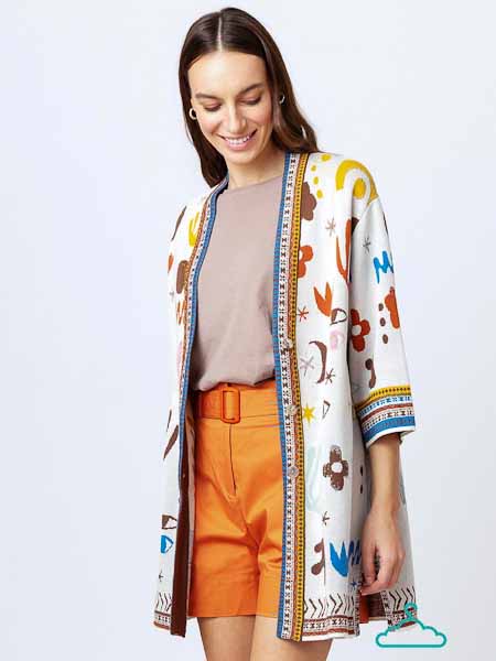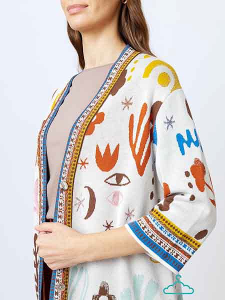 ist die Grundfarbe dieser schönen Strickjacke von Ivko, mit Intarsien mit Nomadenmustern im Jacquardmuster in den Farben blau braun gelb rost rosa mint. Sie wird mit Perlmuttknöpfen geschlossen. Sie ist leicht tailliert, zum Saum hin etwas weiter. Die 3/4 langen Ärmel sind gerade geschnitten, wie am Saum. Angenehm am Hals ist der leicht angeschnittene Kragen am Rückenteil. Die Ausschnittkanten und Abschlußkanten der Ärmel sind im breiten Jacquard- und Bordürenmuster gestrickt. Die Seitennähte haben einen 18 cm hohen Schlitz. Diese Schlitze und die Saumkanten haben eine schmales Bordürenmuster.