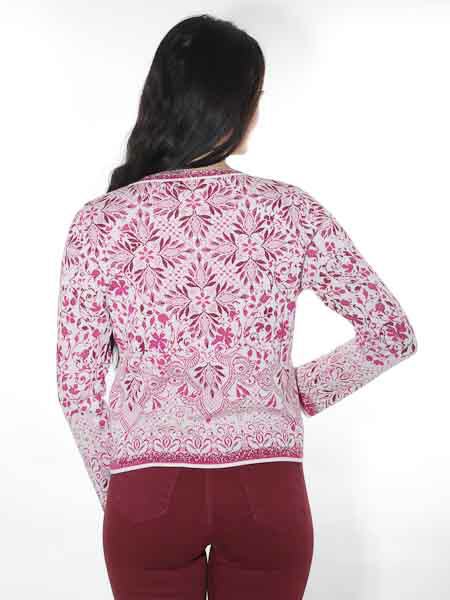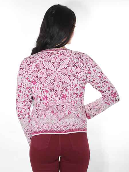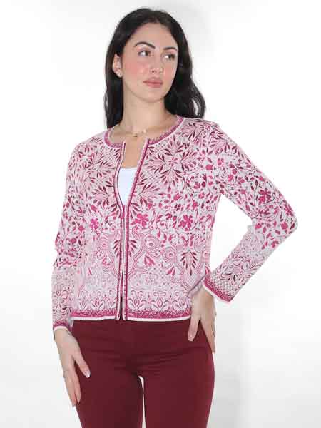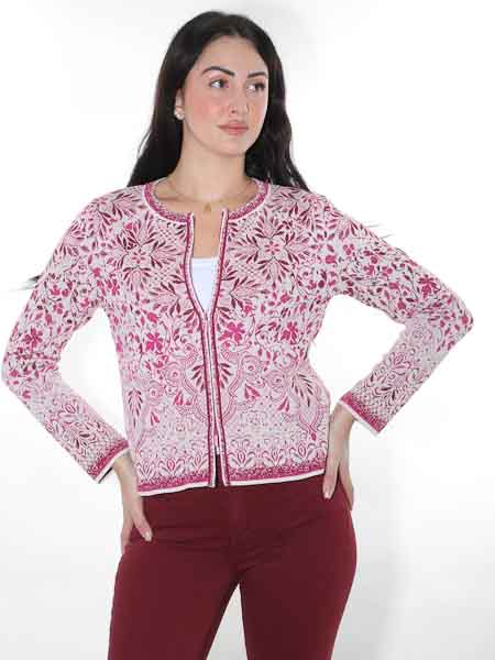 ist die Farbe dieser schönen Strickjacke von Ivko, mit Blumen Mustern, floralen Mustern in den Farben wollweiß, pink und aubergine. Sie hat einen runden Halsausschnitt, wird geschlossen mit einem 2 Wege-Reißverschluß. Sie ist leicht tailliert. Die Ausschnittblende und alle Saumkanten sind im Bordürenmuster gestrickt. Länge ca. 55 cm hinten und 56 cm vorn in Größe 38.