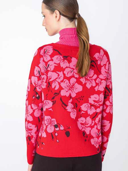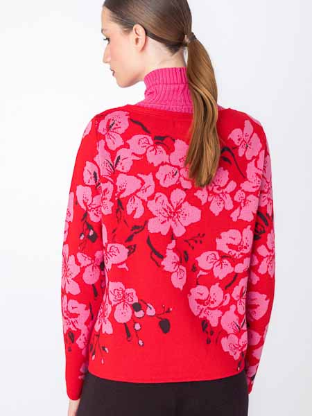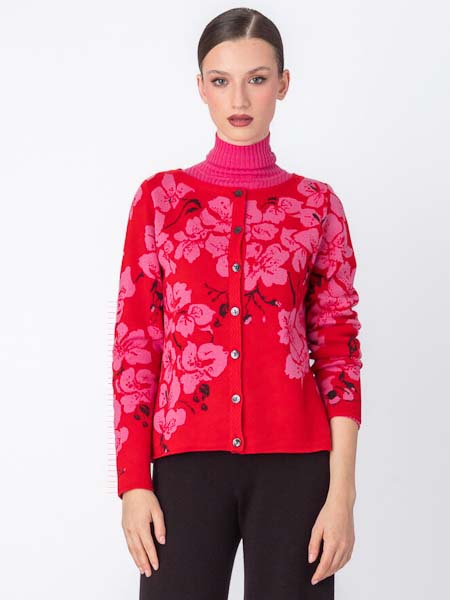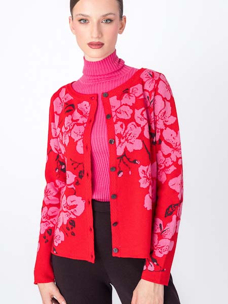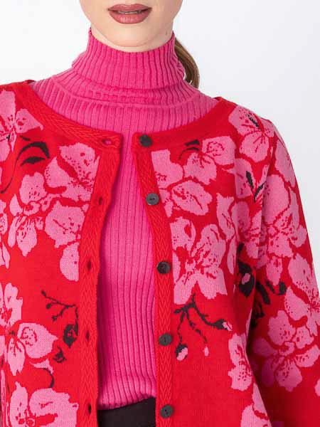 ist die Grundfarbe dieser farbenfrohen Strickjacke von Ivko, im Jacquardmuster im Blumenmuster mit Orchideen in den Farben pink und ein wenig schwarz (wirkt wie aubergine). Sie hat einen runden Ausschnitt, wird mit auberginefarbenen Knöpfen geschlossen. Die schöne Strickjacke ist leicht tailliert. Die Halsausschnittkanten und die Knopfblende sind im Strukturmuster gestrickt. Länge ca. 58 cm in Größe 38.