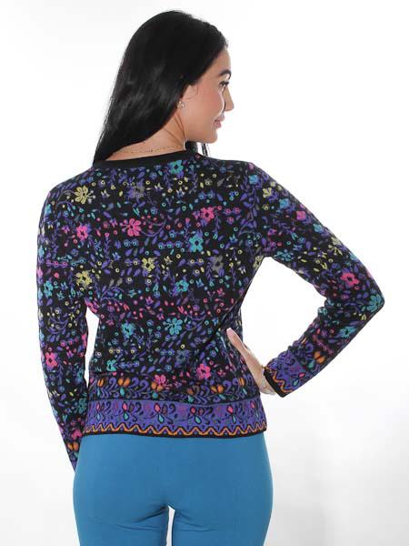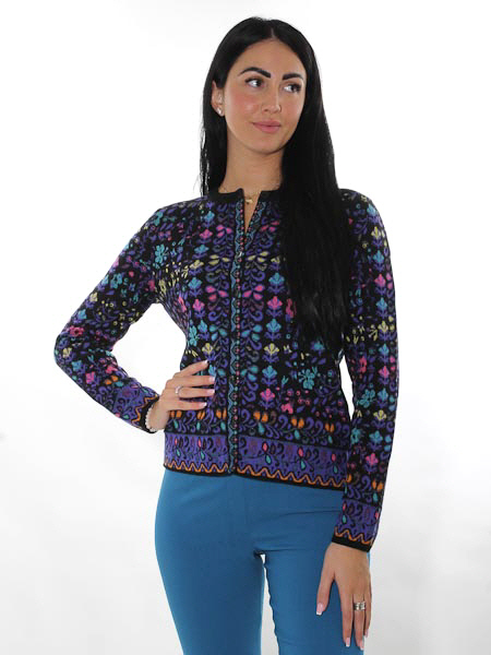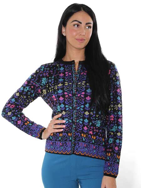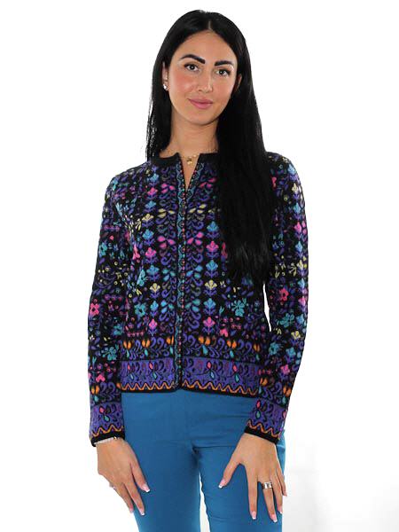 ist die Grundfarbe dieser schönen Strickjacke von Ivko, mit Blumen Mustern und Ornamenten in den Farben pink, petrol, lila, orange. Sie hat einen runden Hals-Ausschnitt, wird geschlossen mit kleinen Knöpfen. Sie ist gerade geschnitten. Die Blenden an den Knopfleisten und an den Saumkanten sind im Bordürenmuster gestrickt. Die Halsausschnittblende ist uni schwarz.