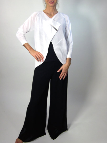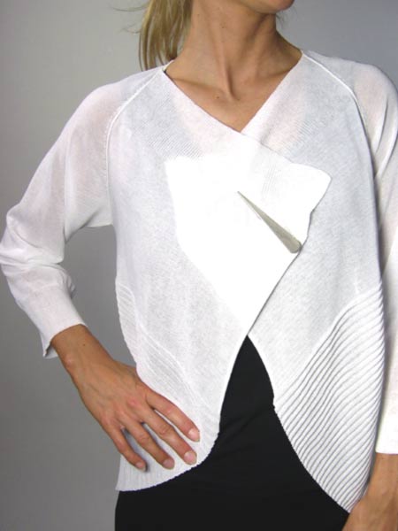 ist diese leichte, transparente Strickjacke von Crea in strahlendem Weiss. Sie ist a-förmig geschnitten, wird mit einer dekorativen Metallnadel geschlossen. Sie hat 3/ 4 lange Ärmel. Sie ist am Rückenteil ca. 76 cm lang. Wir zeigen dazu ein Top von Crea.