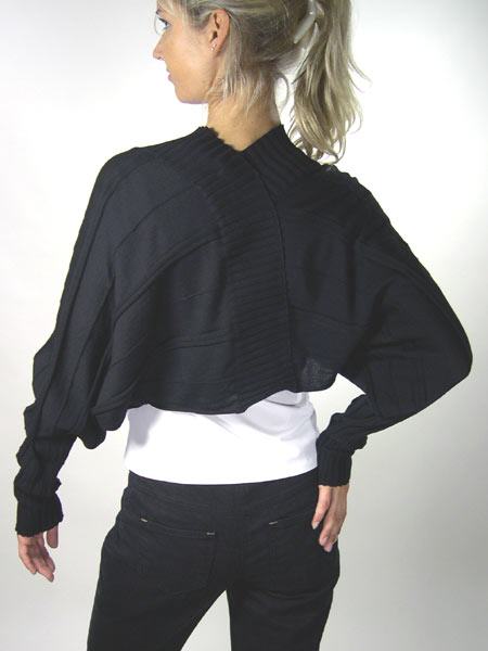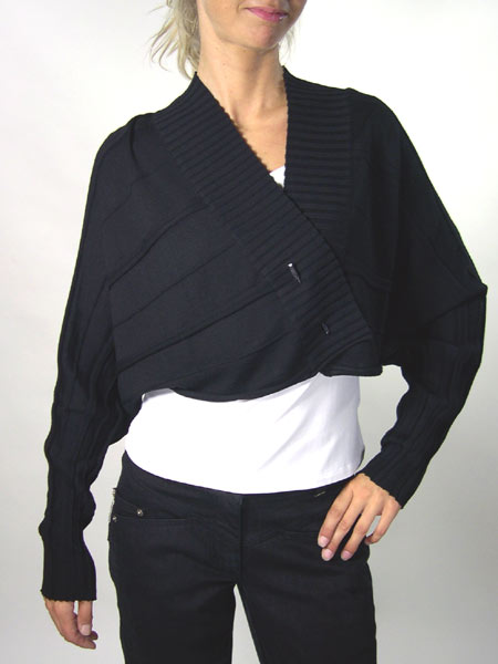 Fledermausärmel hat diese kurze Strickjacke von Crea. quer gestrickt. Sie wird diagonal mit einer Hutnadel geschlossen. Die Ärmel sind überlang, lassen sich gut mit Umschlag tragen.