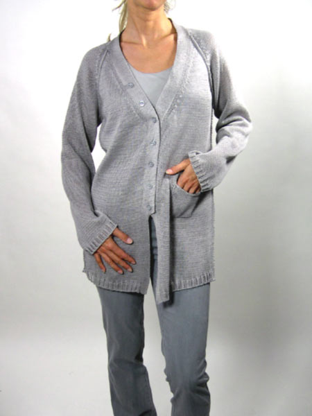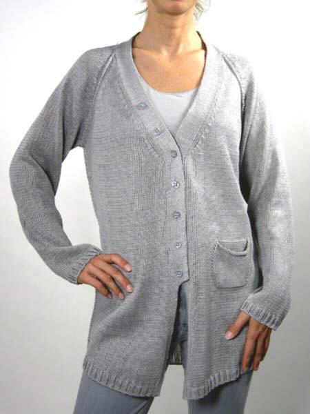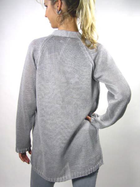 Lässige Leinenstrickjacke von Crea in der typischen Leinenfarbe kitt. Sie ist vorne etwas länger als hinten, hat eine kleine Tasche. Die Nähte sind nach aussen gelegt. Länge der Jacke ca. 76-82 cm.
