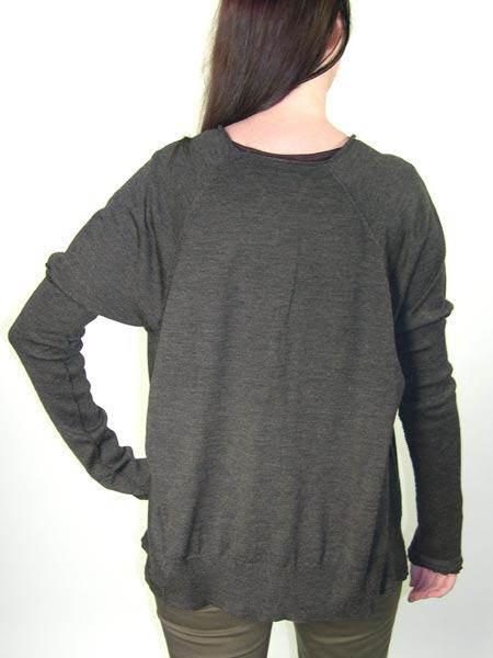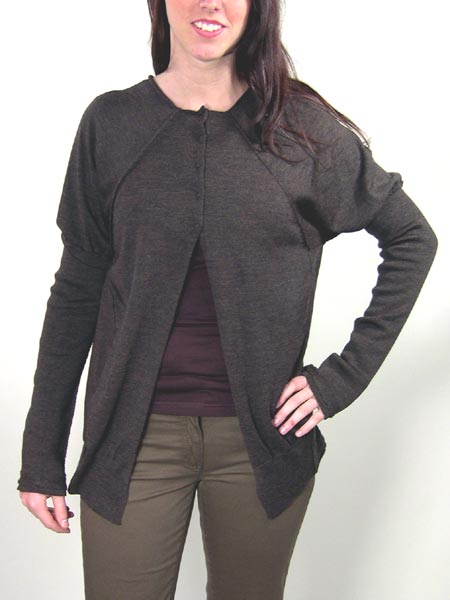 hat diese aussergewöhnliche Strickjacke in braunmelange von Crea. Sie wird mit 5 verdeckten Druckknöpfen geschlossen, ist a-förmig geschnitten, mit Balloneffekt am Saum durch die breiten Bündchen. Die in Rippe gestrickten Ärmel sind überlang.