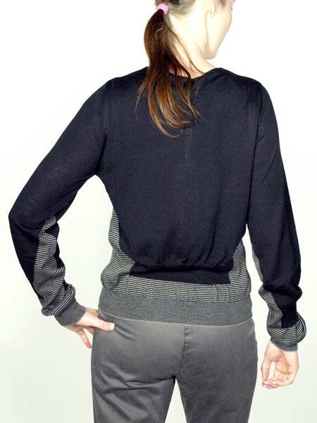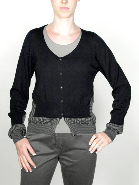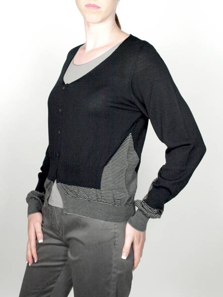 im Schnitt ist diese aparte Strickjacke von Crea, in schlamm/schwarz, mit 2 Bündchen, eines in Taillenhöhe und eines am unteren Rand. Länge der Jacke am Rückenteil ca. 61 cm.