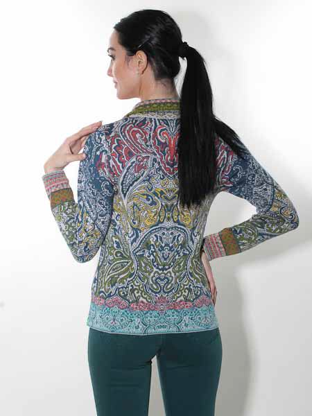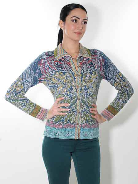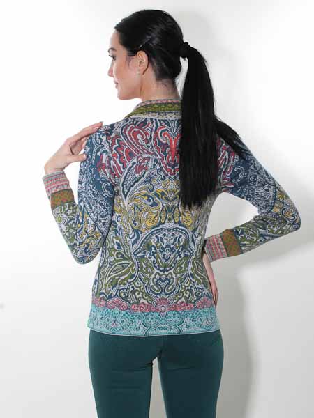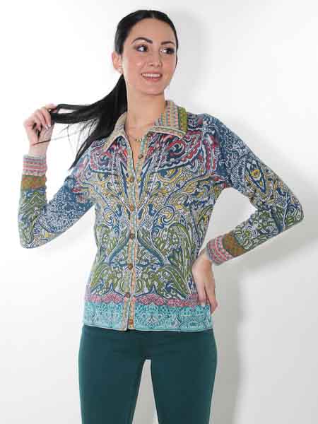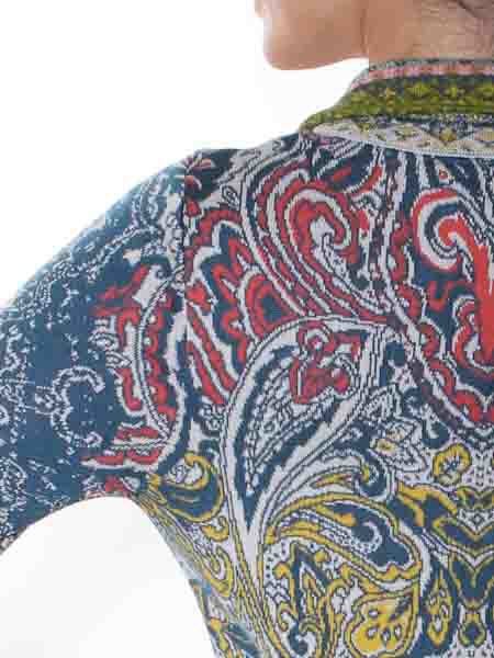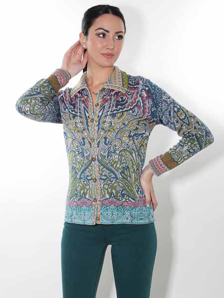 hat diese schöne Strickjacke von Glückspilz in den Farben petrol, hellgrau, gelb, rost, olivgrün ein wenig rosa, apricot in den Bordüren und am Kragen, in Jacquardmustern mit Paisleys und floralen Motiven gestrickt. Sie wird kleinen Holzknöpfen geschlossen. Sie ist leicht tailliert. Die Saumkanten und der Kragen sind im Bordürenmuster gestrickt. Die Baumwoll-/Viscosemischung ist kuschelig weich auf der Haut. Die Baumwolle ist angeraut. Länge ca. 61 cm in Gr. M.